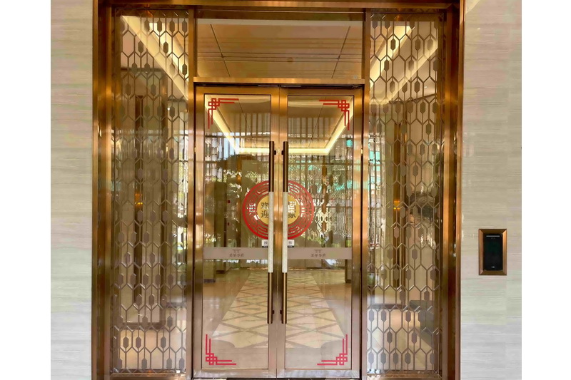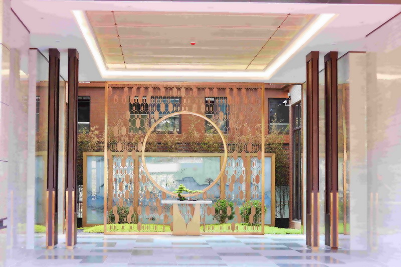 首先映入眼簾的是高級大氣的入戶大堂,左右兩邊的走廊邊以及正前方大幅鏤空圓形屏風(fēng),主要采用不銹鋼與鋁板雕刻相結(jié)合,加上小擺件、小掛件每一處都精細(xì)裝飾著。